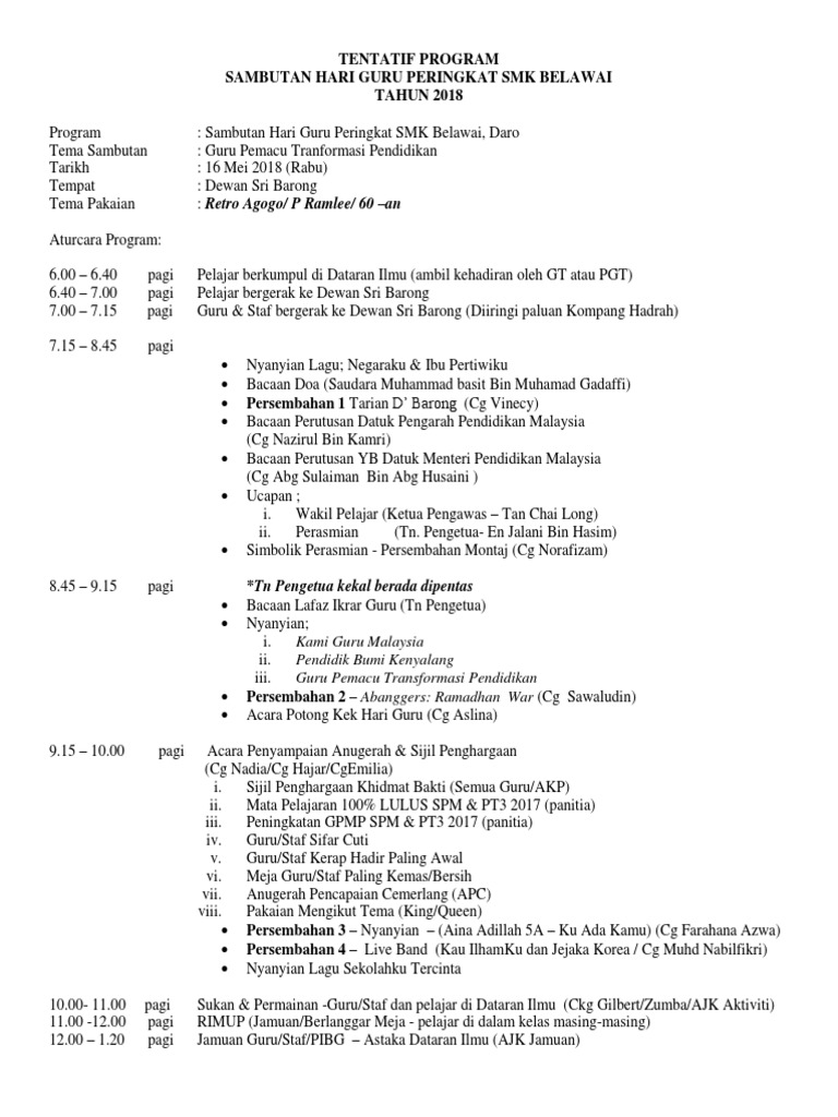Tentatif Program Sambutan Hari Guru Peringkat Smk Belawai Tahun 2018