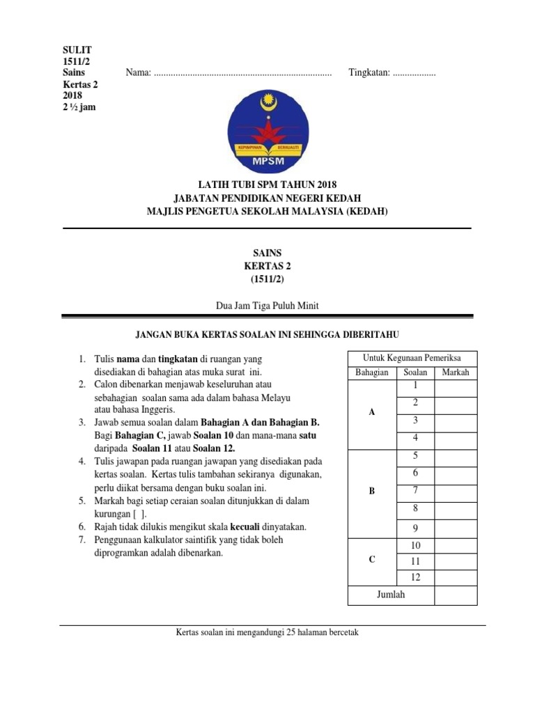 Percubaan Sains Spm 2018 Kertas 2 Kedah Answer Pdf